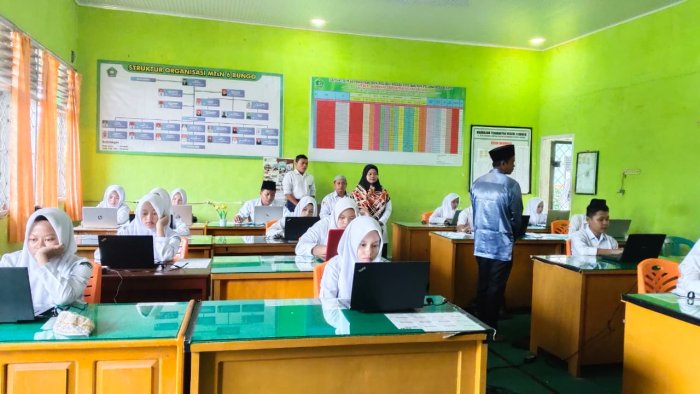 Hari pertama pelaksanaan Ujian TKA (Tes Kemampuan Akademik) di MTsN 6 Bungo berlangsung dengan penuh semangat dan keseriusan. Para siswa hadir dengan persiapan terbaik, membawa harapan besar untuk menunjukkan hasil belajar yang telah mereka tempuh selama ini. Suasana madrasah terasa lebih khidmat, dipenuhi fokus dan tekad dari setiap peserta ujian.